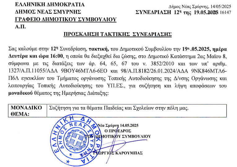 Ο Δήμος Νέας Σμύρνης καλεί τους ενδιαφερόμενους στη 12η Συνεδρίαση Δημοτικού Συμβουλίου που θα γίνει τη Δευτέρα 19 Μαΐου στις 16:00 με μοναδικό θέμα τα θέματα Παιδείας και Σχολείων της πόλης.