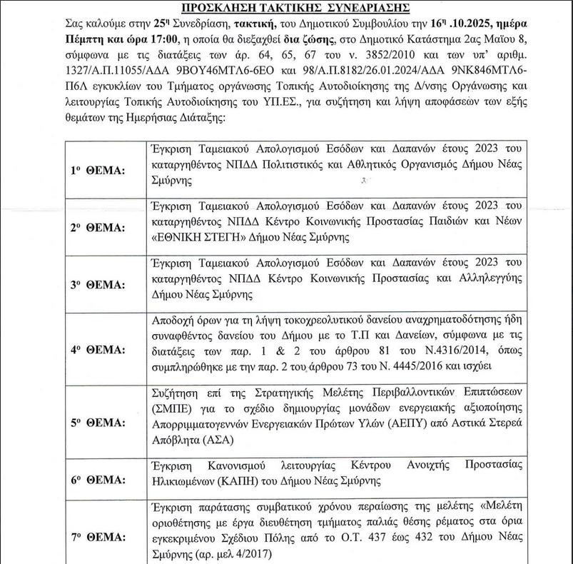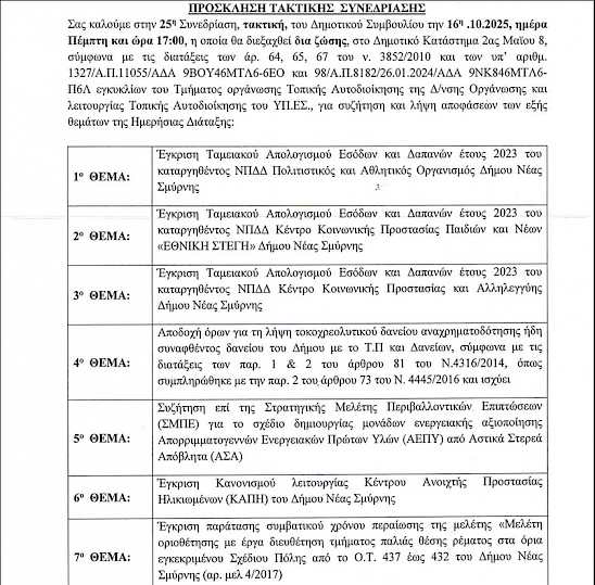 Ο Δήμος Νέας Σμύρνης καλεί τους ενδιαφερόμενους στην 25η Συνεδρίαση του Δημοτικού Συμβουλίου που θα γίνει την Πέμπτη 16 Οκτωβρίου στις 17:00 στο Δημοτικό Κατάστημα. Αναλυτικά:
