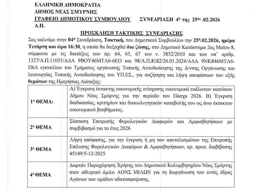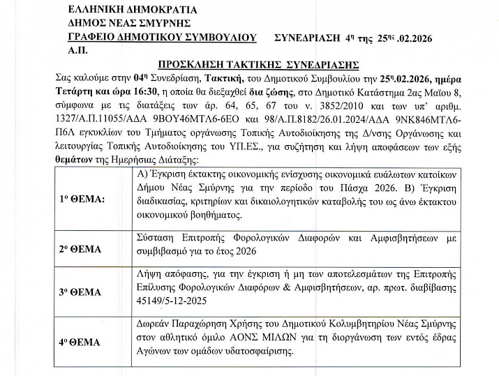 Ο Δήμος Νέας Σμύρνης καλεί τους ενδιαφερόμενους στην 4η Τακτική Συνεδρίαση του Δημοτικού Συμβουλίου που θα γίνει την Τετάρτη 25 Φεβρουαρίου στο Δημοτικό Κατάστημα.