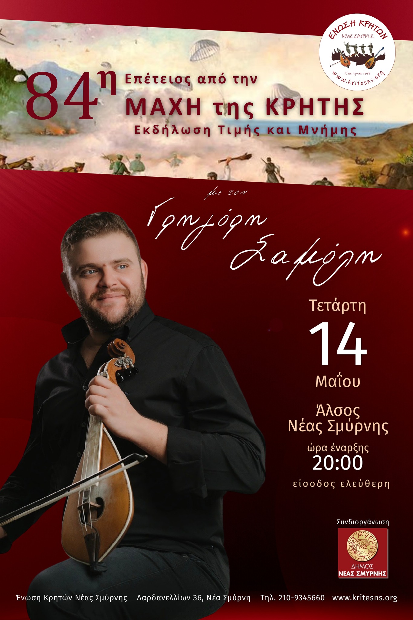 Μια μεγάλη εκδήλωση τιμής και μνήμης για την 84η επέτειο από την Μάχη της Κρήτης συνδιοργανώνουν η Ένωση Κρητών και ο Δήμος Νέας Σμύρνης αύριο Τετάρτη 14 Μαΐου στο Άλσος.