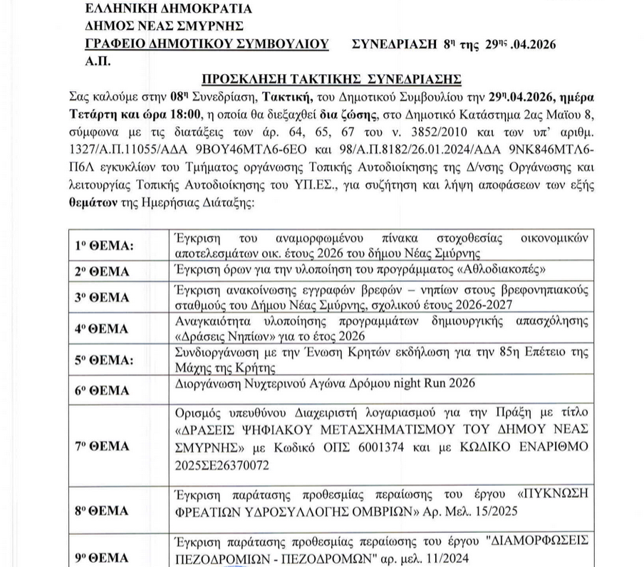 Ο Δήμος Νέας Σμύρνης καλεί τους ενδιαφερόμενους στην 8η Τακτική Συνεδρίαση του Δημοτικού Συμβουλίου που θα γίνει την Τετάρτη 29 Απριλίου στις 18:00 διά ζώσης στο Δημοτικό Κατάστημα.
