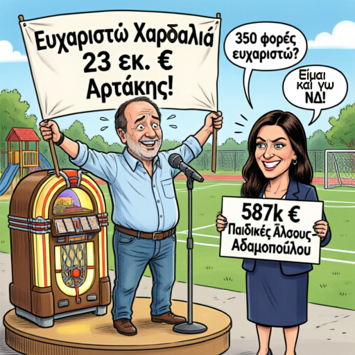 Ο Κουτελάκης αφιερώνει ολόκληρες αναρτήσεις στον Χαρδαλιά. Εκείνος παρουσιάζει τα 23 εκατομμύρια ως δώρο θεών για το Αρτάκης, με ολοκλήρωση το 2027. Η ανάρτηση δέχθηκε περίπου 80 σχόλια, τα περισσότερα κριτικά για υπερβολική εξύμνηση και «γλείψιμο». Η Αδαμοπούλου από την άλλη συνέβαλε με 587.500 ευρώ για παιδικές χαρές σε Άλσος και Πλ. Φλέμινγκ. Οι εργασίες περιλαμβάνουν πιστοποιημένα όργανα παιχνιδιού, δάπεδα ασφαλείας, φωτισμό και παγκάκια. Η παράδοση πλησιάζει το Πάσχα. Παρά την κοινή αυτοψία, δεν υπάρχει ούτε ένα tag ή mention της στο post του δημάρχου. Μήπως τα παγκάκια και τα όργανα δεν τραβάνε likes όσο τα γήπεδα;