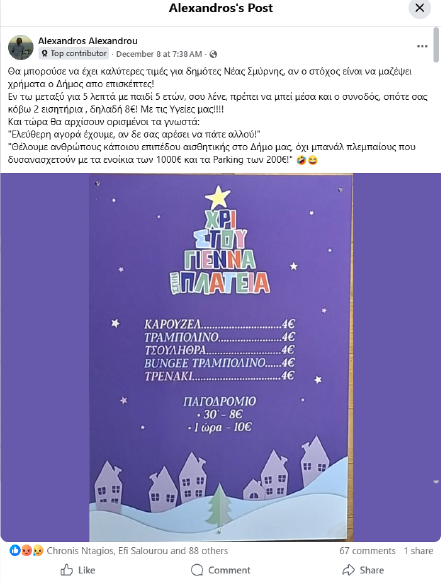 Ο Δήμος Νέας Σμύρνης εκμίσθωσε την Κεντρική Πλατεία (193-195) για τις Χριστουγεννιάτικες εκδηλώσεις 2025–2026 στην εταιρεία DREAMSTAR, με συνολικό μίσθωμα 8.000€ για 30 ημέρες, για περίπου 1.500 τ.μ. γεμάτα καρουζέλ, bungee, σκηνές, LED οθόνες και βοηθητικές κατασκευές. Στην πράξη, ο κεντρικός δημόσιος χώρος της πόλης μετατρέπεται σε εμπορικό Χριστουγεννιάτικο πάρκο, στο οποίο η απλή χρήση από τους πολίτες είναι περιορισμένη, καθώς η πρόσβαση στις δραστηριότητες γίνεται κυρίως με εισιτήριο, ενώ ο Δήμος δεν παίρνει ποσοστό από τα έσοδα, παρά μόνο το χαμηλό σταθερό ενοίκιο.