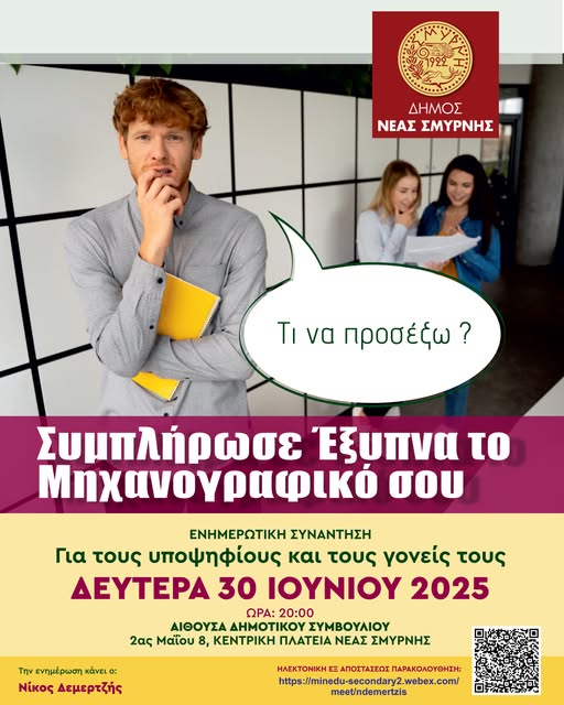 Την ενημέρωση θα κάνει ο Σύμβουλος Σταδιοδρομίας και Διευθυντής του 5ου Γενικού Λυκείου Νέας Σμύρνης Νίκος Δεμερτζής, ο οποίος θα δώσει χρήσιμες συμβουλές για το πως θα πρέπει συμπληρωθεί σωστά το μηχανογραφικό και θα επισημάνει τι θα πρέπει να προσέξουν οι υποψήφιοι που θα κληθούν να επιλέξουν την Σχολή της αρεσκείας τους.
