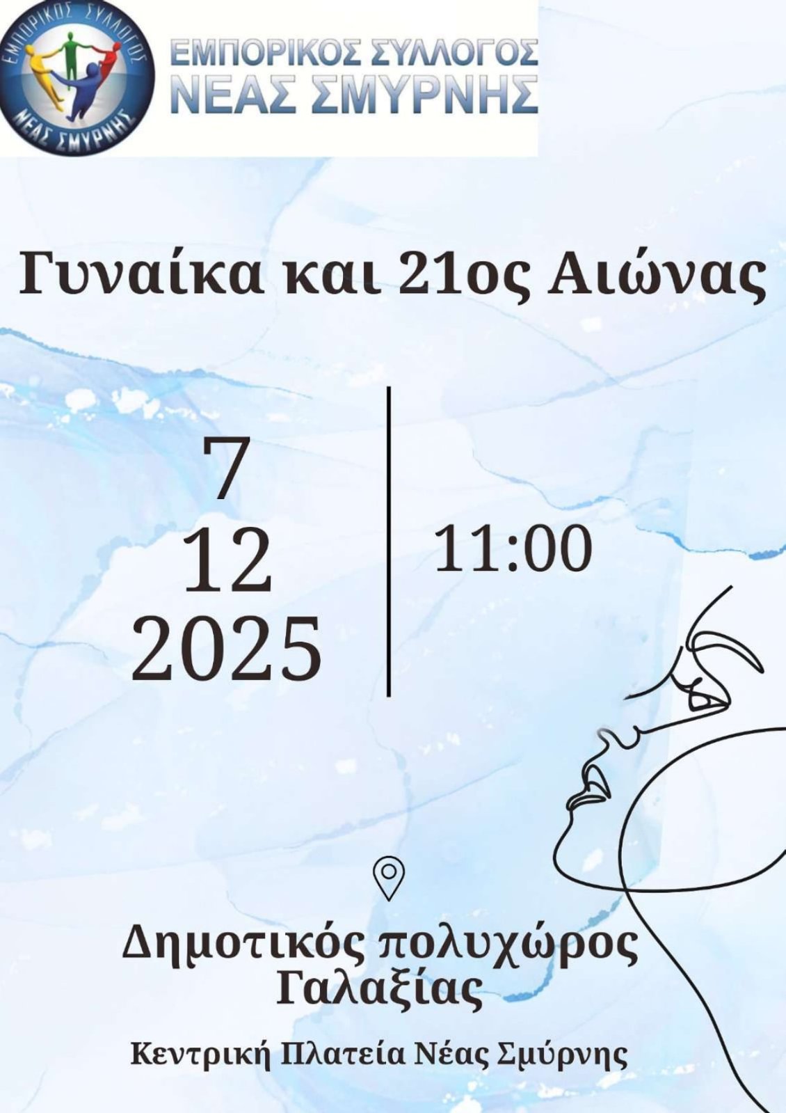 Εκδήλωση με θέμα «Γυναίκα και 21ος Αιώνας» διοργανώνει ο Εμπορικός Σύλλογος Νέας Σμύρνης την Κυριακή 7 Δεκεμβρίου, ώρα 11:00 στον Δημοτικό Πολυχώρο «Γαλαξίας»