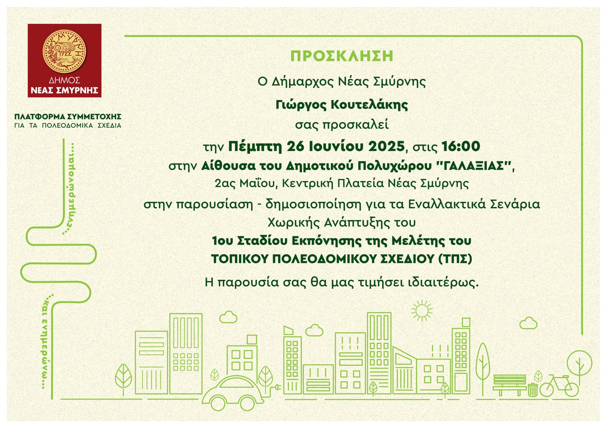 Τα εναλλακτικά σενάρια χωρικής ανάπτυξης του 1ου σταδίου εκπόνησης της μελέτης του Τοπικού Πολεοδομικού Σχεδίου (ΤΠΣ) του Δήμου Νέας Σμύρνης παρουσιάζονται την Πέμπτη 26 Ιουνίου 2025 και ώρα 16:00 στον Δημοτικό Πολυχώρο "Γαλαξίας" .