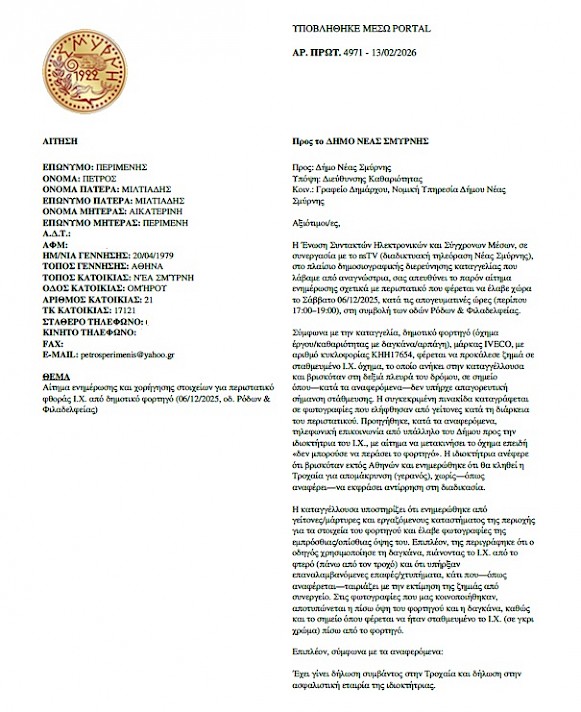 Μια σοβαρή καταγγελία από κάτοικο της Νέας Σμύρνης φέρνει στο φως πιθανό ατύχημα με δημοτικό φορτηγό καθαριότητας, το οποίο φέρεται να προκάλεσε ζημιά σε σταθμευμένο αυτοκίνητο χρησιμοποιώντας δαγκάνα. Το περιστατικό συνέβη στις 6 Δεκεμβρίου 2025, στη συμβολή Ρόδων και Φιλαδελφείας, και έχει πυροδοτήσει ερωτήματα για την ευθύνη του Δήμου.