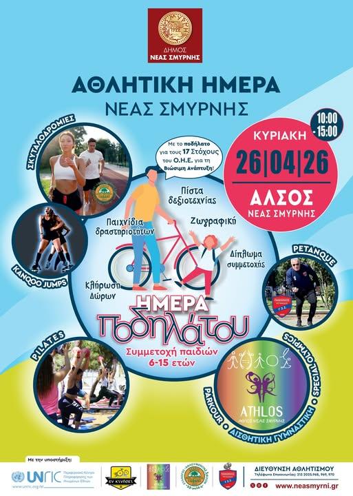 Η Νέα Σμύρνη φοράει τα αθλητικά της και διοργανώνει, την Κυριακή 26 Απριλίου, στο Άλσος, την Αθλητική Ημέρα με πρωταγωνιστή το ποδήλατο για παιδιά 6-15 ετών και πλήθος άλλες δραστηριότητες για μικρούς και μεγάλους.