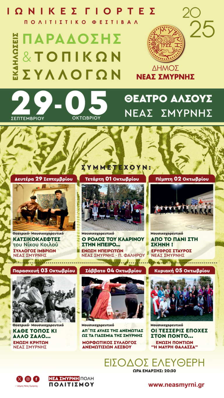 Το δεύτερο μέρος των Ιωνικών Γιορτών συνεχίζεται από τις 29 Σεπτεμβρίου έως τις 5 Οκτωβρίου στο Άλσος μ’ ένα πανόραμα εκδηλώσεων παράδοσης των τοπικών Συλλόγων της Νέας Σμύρνης.