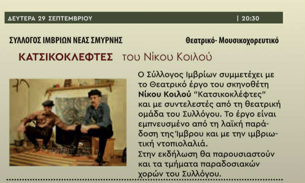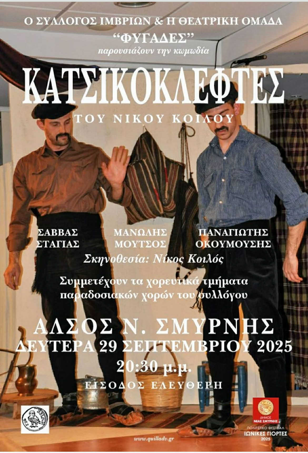 Δείτε από το Nstv ζωντανά την παράσταση του συλλόγου Ιμβρίων και της θεατρικής ομάδας "Φυγάδες", "Οι Κατσικοκλέφτες", αύριο Δευτέρα (29/9) στις 20:30 από το Άλσος νέας Σμύρνης.