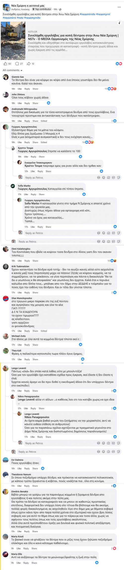 Ο Γιώργος Αργυρόπουλος γράφει: «Εξιλαστήριο θύμα για τα μάτια του κόσμου. Εδώ δίπλα μας ξερίζωσαν 3 Μουριές κ 4 Ελιές κ δεν τους ενόχλησε κανείς». Η Κριστιν Τουμα προσθέτει: «Επρεπε να καλέσετε το 100». Επίσης, η Sofia Marko τονίζει: «Καταγγελία επί τόπου έπρεπε».