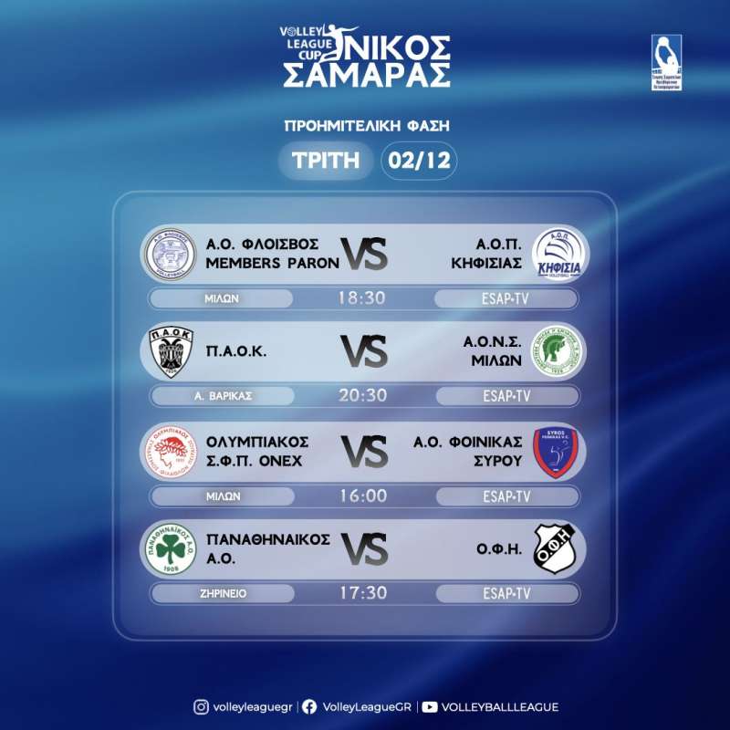 Τα γήπεδα Κροίσος Πέρσης και Ανδρέας Βαρίκας στη Νέα Σμύρνη, το Σοφία Μπεφόν στο Παλαιό Φάληρο και το Ζηρίνειο στην Κηφισιά θα φιλοξενήσουν τις ομάδες που διεκδικούν μια θέση στους ημιτελικούς της Τετάρτης 3/12, ενώ ο μεγάλος τελικός θα διεξαχθεί την Πέμπτη 4 Δεκεμβρίου, στο γυμναστήριο «Ανδρέας Βαρίκας», στις 17:00 (ΕΡΤ-2 Σπορτ). Το πρώτο τρόπαιο της σεζόν πλησιάζει – και η μάχη για την κορυφή αναμένεται συναρπαστική.