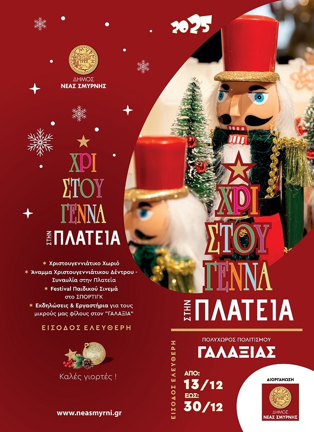 Η θαλπωρή των Χριστουγέννων θα πλημμυρίσει αυτή την χρονιά τους δημόσιους χώρους της Νέας Σμύρνης, κάνοντας την εορταστική περίοδο μαγευτική για όλους. Ο Δήμος Νέας Σμύρνης με επίκεντρο την Πλατεία και τον Δημοτικό Πολυχώρο Πολιτισμού «Γαλαξίας» έχει προετοιμάσει σειρά εκδηλώσεων για να μείνουν αυτά τα Χριστούγεννα αξέχαστα.