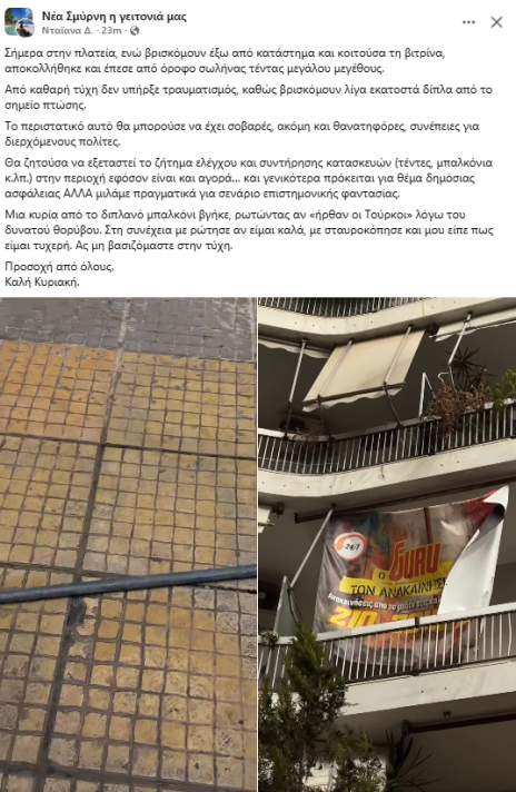 Μια κάτοικος Νέας Σμύρνης περιγράφει πως το μεσημέρι της Κυριακής, ενώ κοιτούσε βιτρίνα καταστήματος στην κεντρική πλατεία, αποκολλήθηκε και έπεσε από όροφο σωλήνας τέντας μεγάλου μήκους. Η πτώση έγινε ακριβώς δίπλα της – λίγα μόλις εκατοστά – με αποτέλεσμα να γλιτώσει από σοβαρό τραυματισμό αποκλειστικά από τύχη, όπως η ίδια αναφέρει στην ανάρτησή της στη δημοφιλή τοπική ομάδα «Νέα Σμύρνη η γειτονιά μας». Το συμβάν προκάλεσε πανικό στους παρευρισκόμενους και έντονο θόρυβο, με γειτόνισσα να βγαίνει στο μπαλκόνι ρωτώντας χαρακτηριστικά «ήρθαν οι Τούρκοι;», πριν διαπιστώσει ότι πρόκειται για πτώση τμήματος τέντας.