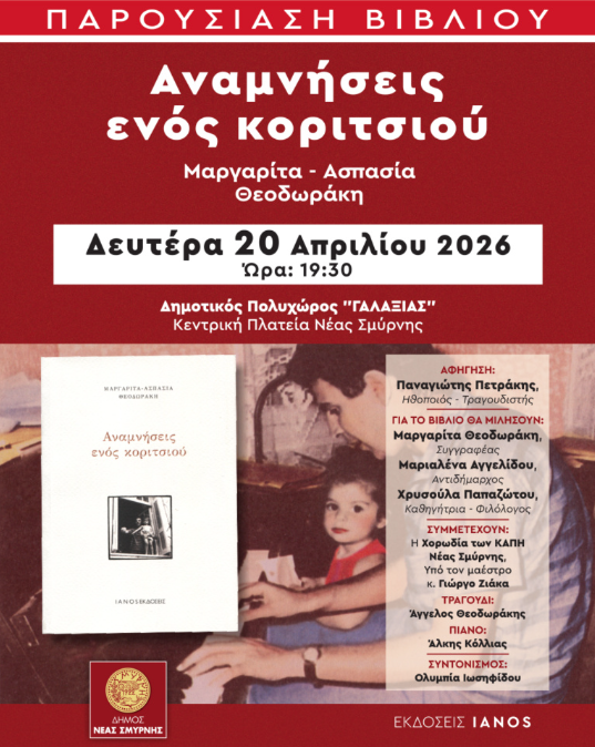 Το βιβλίο ης Μαργαρίτας – Ασπασίας Θεοδωράκη “Αναμνήσεις ενός κοριτσιού” παρουσιάζεται την Δευτέρα 20 Απριλίου, ώρα 19:30 στον Δημοτικό Πολυχώρο “Γαλαξίας”