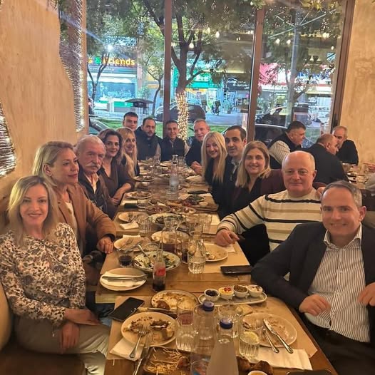 Η εικόνα απεικονίζει μια μεγάλη παρέα καθισμένη γύρω από ένα καλά σερβιρισμένο τραπέζι με μεζέδες, κρασιά, σόδα και πιάτα σε ένα ζεστό εστιατόριο με μεγάλα παράθυρα, δέντρα και φωτισμούς έξω. Στο κέντρο φαίνεται ο Γρηγόρης Δημητριάδης με σκούρο πουκάμισο και η Δήμητρα Νάνου κοντά του, ενώ η λεζάντα "Ο ανηψιός Μητσοτάκη στην πόλη μας με την κυρία Νάνου και την ομάδα της" χαρακτηρίστηκε από πολλούς ως προκλητική και υποτιμητική.