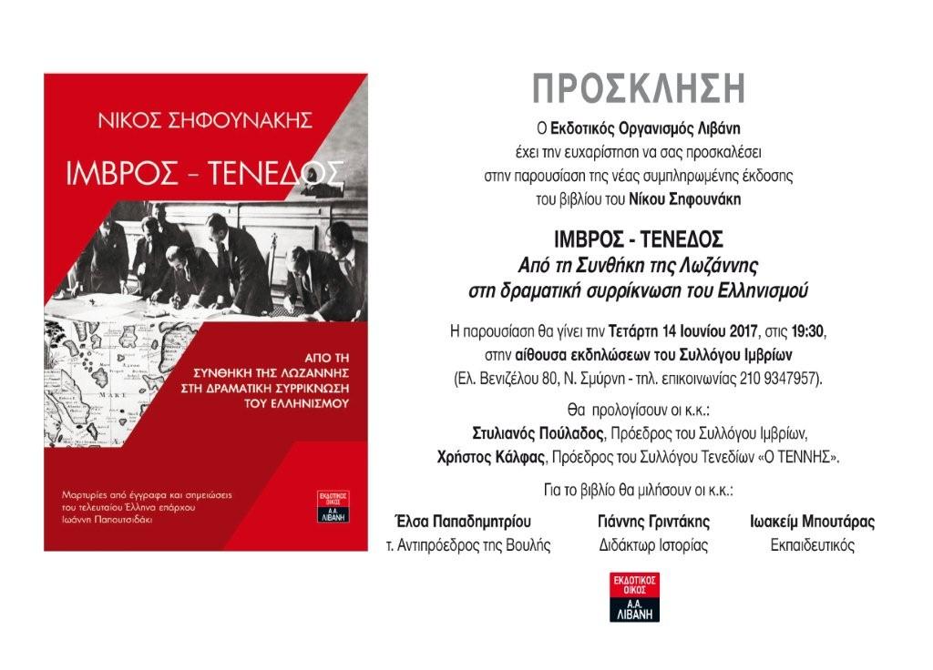 Παρουσίαση νέας συμπληρωμένης έκδοσης του βιβλίου του Ν.Σηφουνάκη "ΙΜΒΡΟΣ - ΤΕΝΕΔΟΣ Από τη Συνθήκη της Λωζάννης στη δραματική συρρίκνωση του Ελληνισμού"