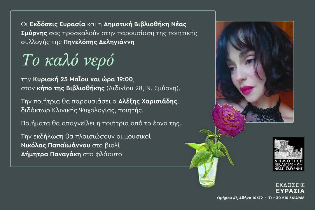 Η ποιητική συλλογή της Πηνελόπης Δεληγιάννη "Το καλό νερό" (Εκδόσεις Ευρασία) παρουσιάζεται την Κυριακή 25 Μαΐου, ώρα 19:00, στην Δημοτική Βιβλιοθήκη Νέας Σμύρνης (Αϊδινίου 28) στο πλαίσιο του Φεστιβάλ Κήπου.