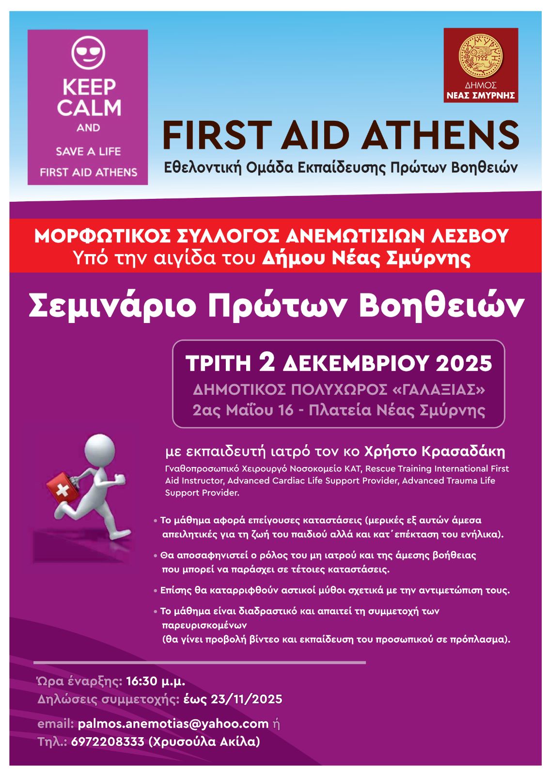 Σεμινάριο Πρώτων Βοηθειών διοργανώνει ο Μορφωτικός Σύλλογος Ανεμωτίσιων Λέσβου την Τρίτη 2 Δεκεμβρίου ώρα 16:30 στον Δημοτικό Πολυχώρο "Γαλαξίας" με την υποστήριξη του Δήμου Νέας Σμύρνης.