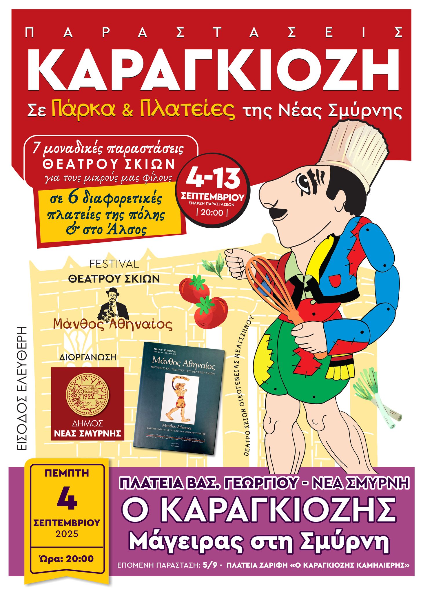 Με την παράσταση "Ο Καραγκιόζης μάγειρας στη Σμύρνη" στην Πλατεία Βασιλέως Γεωργίου ξεκινά την Πέμπτη 4 Σεπτεμβρίου το Φεστιβάλ Καραγκιόζη "Μάνθος Αθηναίος" του Δήμου Νέας Σμύρνης που θα εξελιχτεί σε πλατείες και πάρκα της πόλης