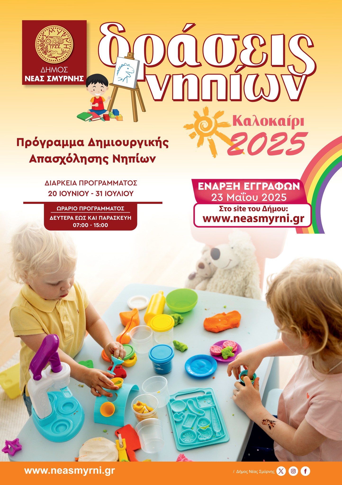 Ξεκινούν αύριο 23 Μαΐου οι εγγραφές για το Πρόγραμμα Δημιουργικής Απασχόλησης Νηπίων του Δήμου Νέας Σμύρνης.