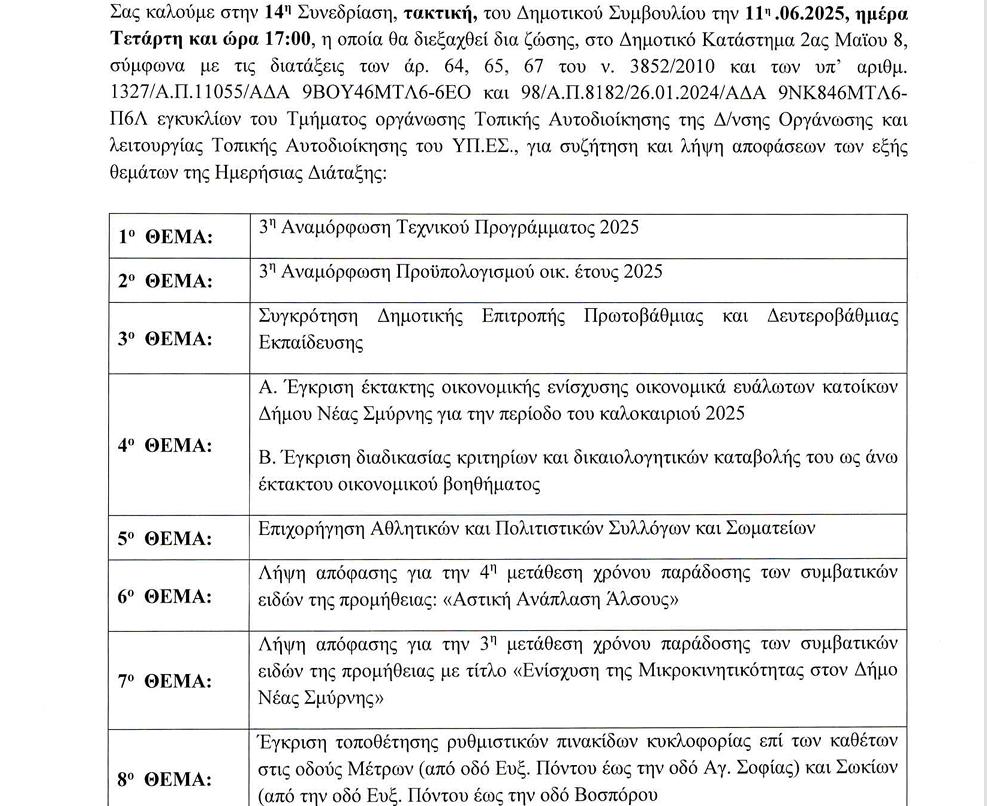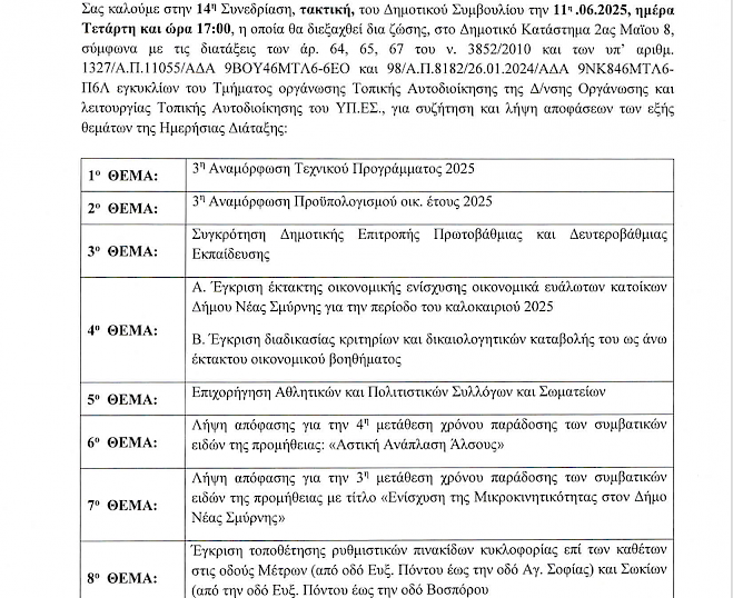 Ο Δήμος Νέας Σμύρνης καλεί τους ενδιαφερόμενους στη 14η Τακτική Συνεδρίαση του Δημοτικού Συμβουλίου που θα γίνει την Τετάρτη 11 Ιουνίου στις 17:00 στο Δημοτικό Κατάστημα.