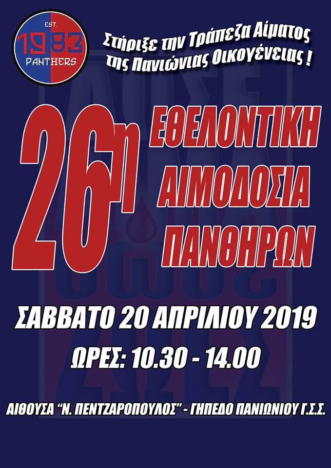 26η Εθελοντική Αιμοδοσία Πανθήρων το Σάββατο 20 Απριλίου