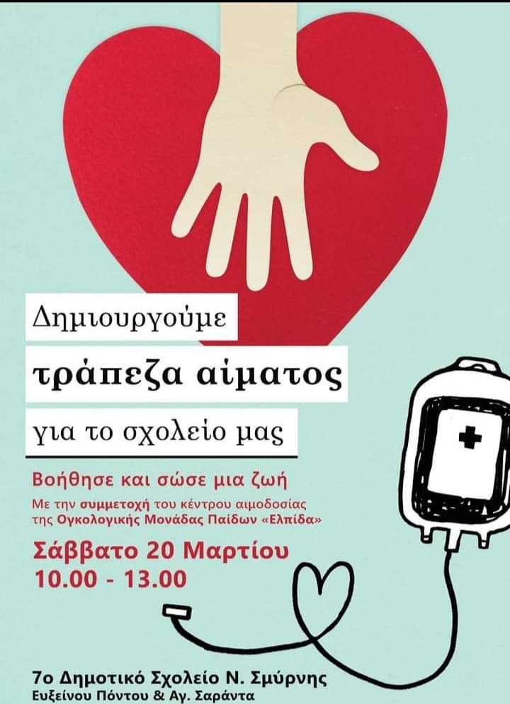 Το Διοικητικό Συμβούλιο του Συλλόγου Γονέων και Κηδεμόνων του 7ου Δημοτικού Σχολείου Νέας Σμύρνης, σε συνεννόηση με το κέντρο αιμοδοσίας της Ογκολογικής Μονάδας Παίδων «Ελπίδα», διοργανώνει το Σάββατο 20 Μαρτίου 2021 από τις 10:00 έως και τις 13:30 αιμοδοσία, προκειμένου να συνεισφέρει στην κάλυψη των αυξημένων αναγκών της Ογκολογικής Μονάδας, αλλά και στην ενίσχυση της τράπεζας αίματος του Σχολείου μας.