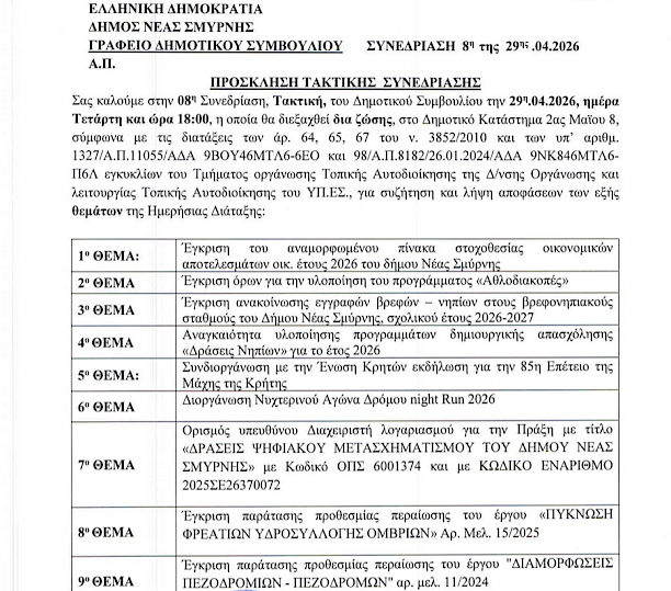 Ο Δήμος Νέας Σμύρνης καλεί τους ενδιαφερόμενους στην 8η Τακτική Συνεδρίαση του Δημοτικού Συμβουλίου που θα γίνει την Τετάρτη 29 Απριλίου στις 18:00 διά ζώσης στο Δημοτικό Κατάστημα.