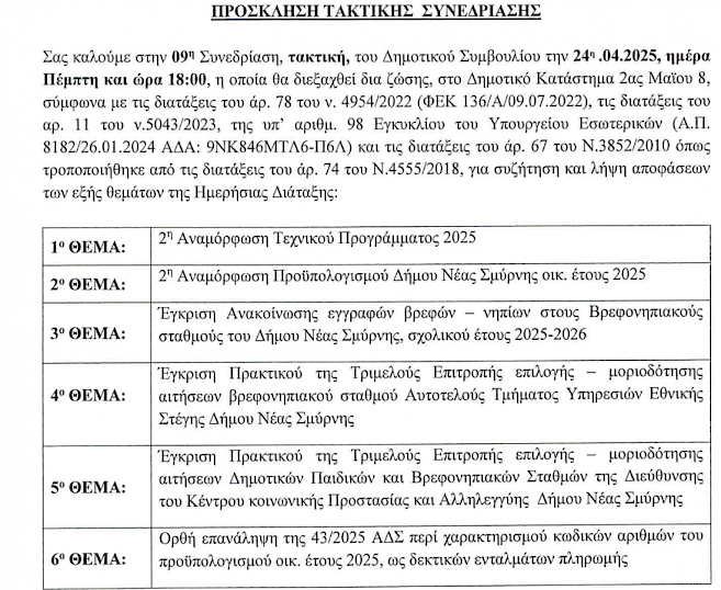 Ο Δήμος Νέας Σμύρνης καλεί τους ενδιαφερόμενους στην 9η Συνεδρίαση του Δημοτικού Συμβουλίου που θα γίνει την Πέμπτη 24 Απριλίου και ώρα 18:00 στο Δημαρχείο.