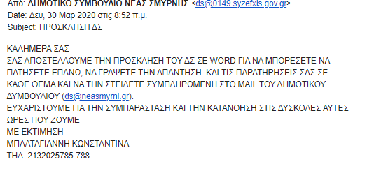 Το νέο του θεσμικό ατόπημα είναι να στείλει πρόσκληση Δημοτικού Συμβουλίου στα μέλη των παρατάξεων όπου τους ζητάει αφ ενός να ΜΗΝ βρεθούν στη ίδια αίθουσα είτε φυσικά είτε διαδικτυακά αφ ετέρου τους στερεί το δικαίωμα του πολιτικού διαλόγου και φυσικά των εναλλακτικών προτάσεων. Αντιθέτως ζητά από οποιοδήποτε μέλος του συμβουλίου το επιθυμεί να υποβάλλει γραπτώς ανά θέμα την απάντηση και την παρατήρησή του. Κατ αυτό τον τρόπο επιβεβαιώνει για άλλη μια φορά την αντιδημοκρατική του διάθεση και το Δημοτικό Συμβούλιο έχει εκπέσει στην κατάσταση να υπερψηφίζονται οι προτάσεις του Δημάρχου πολιτικά ''στα τυφλά'' από τις παρατάξεις της σύμπραξης, χωρίς ουσιαστικό διάλογο.