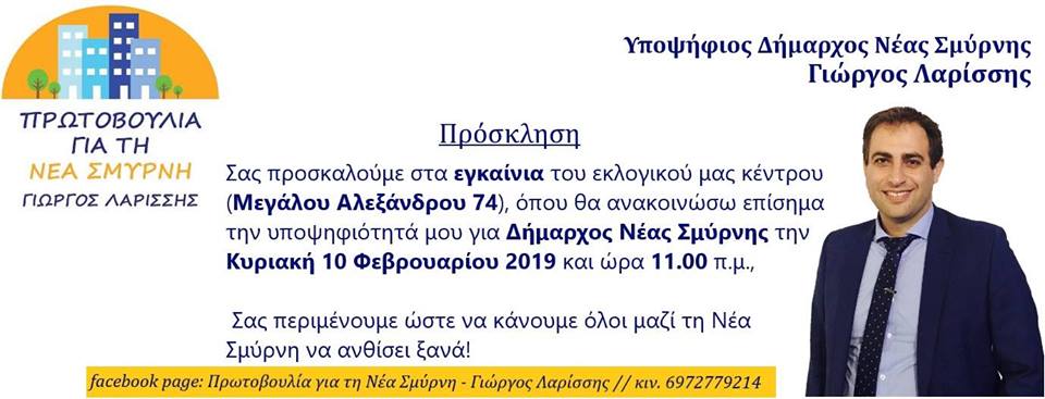 '' Σε μια εκδήλωση, στην οποία η προσέλευση του κόσμου, ο παλμός και το συναίσθημα ξεπέρασαν κάθε προσδοκία, ο Γιώργος Λαρίσσης ανακοίνωσε την υποψηφιότητα του για Δήμαρχος Νέας Σμύρνης. 500 άνθρωποι παρευρέθησαν στα γραφεία του συνδυασμού, εξ ου και τα χαμόγελα περίσσευαν. Τον υποψήφιο δήμαρχο προλόγισε ο αντιπρόεδρος της ΝΔ Κωστής Χατζηδάκης εξαίροντας τον χαρακτήρα του και τη διεθνή επαγγελματική του σταδιοδρομία που όπως χαρακτηριστικά τόνισε, «μπορεί να πει κανείς ότι για έναν άνθρωπο μόλις 40 ετών, έχει κάνει πράγματα που άλλος θα είχε κάνει σε μια ολόκληρη ζωή» και συνέχισε λέγοντας ότι «για αυτό το λόγο θα είναι ένας καλός δήμαρχος για τη Νέα Σμύρνη». Συνέχισαν, εκφράζοντας δημοσίως την υποστήριξη τους με θερμά και αγωνιστικά λόγια η Βουλευτής ΝΔ Άννα Καραμανλή, ο Βουλευτή ΝΔ Χαρης Θεοχάρης, ο Δήμαρχος Καλλιθέας Δημήτρης Κάρναβος, ο Δήμαρχος Δάφνης-Υμηττού και υποψ. Βουλευτής Μιχάλης Σταυριανουδάκης. Σε συνέντευξη του στη συνέχεια εξέφρασε δημοσίως την υποστήριξη του ο παρευρισκόμενος υποψ. Βουλευτής ΝΔ Κωνσταντίνος Κυρανάκης και ο Πρόεδρος της Νομαρχιακής Οργάνωσης της ΝΔ, Μιχάλης Κουμεντάκος. Ήρθαν για να εκφράσουν την υποστήριξη τους η υποψ. Βουλευτής του βορείου τομέα Β Αθηνών Ζωή Ράπτη και οι υποψ. βουλευτές του νοτίου τομέα Τάσος Γαϊτάνης, Ντόρα Πάλλη, Γιάννης Καλλιάνος. Ο βουλευτής β Αθηνών Νίκος Δένδιας που είχε ανακοινώσει την επίσημη υποψηφιότητα της ΝΔ στο Δήμο Νέας Σμύρνης προ αρκετών εβδομάδων, εκπροσωπήθηκε δια του συνεργάτη του Δημήτρη Περδίκη. Ιδιαίτερα σημαντική συγκινητική παρουσία που μας συνδέει με το παρελθόν της παράταξης, αποτέλεσε και η πρ. Βουλευτής Φάνη Πάλλη-Πετραλιά. Ο υποψ. Περιφερειάρχης Γιώργος Πατούλης απέστειλε μήνυμα στήριξης και αυτό διαβάστηκε από την υποψήφια περιφερειακή σύμβουλο Δήμητρα Νάνου.