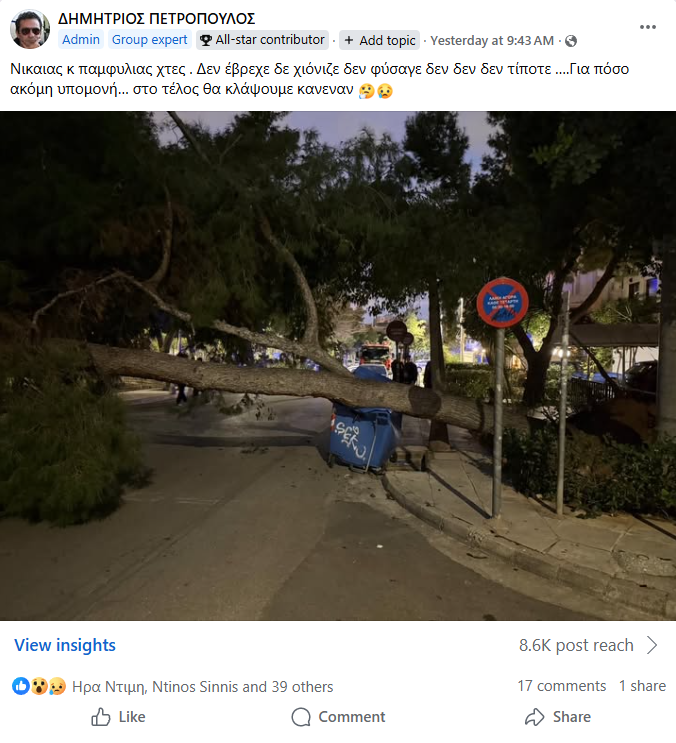 Δεν είναι θέμα “γκαντεμιάς”, είναι θέμα προτεραιοτήτων: αν προηγούνται οι φιέστες, οι φωτογραφίες, οι δημόσιες σχέσεις, και έπονται οι έλεγχοι, τα συνεργεία και οι δύσκολες αποφάσεις, τότε τα δέντρα θα συνεχίσουν να πέφτουν – και μαζί τους θα πέφτει και η εμπιστοσύνη των πολιτών.