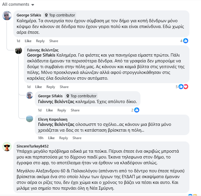 Αντί γι’ αυτά, οι κάτοικοι περιγράφουν ένα Δήμο που αντιδρά μόνο αφού πέσει το δέντρο – και τότε, πάλι, με μισά μέτρα.