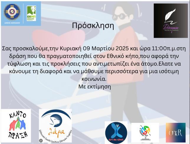 Αυτή τη Κυριακή 9 Μαρτίου στις 11 το πρωί ο Σύλλογος "Καντο Πράξη" σας περιμένει όλους στον Εθνικό κήπο σε μια ακόμα διαδραστική εκδήλωση ευαισθητοποίησης σχετικά με τις προκλήσεις που αντιμετωπίζει ένα άτομο με προβλήματα όρασης.