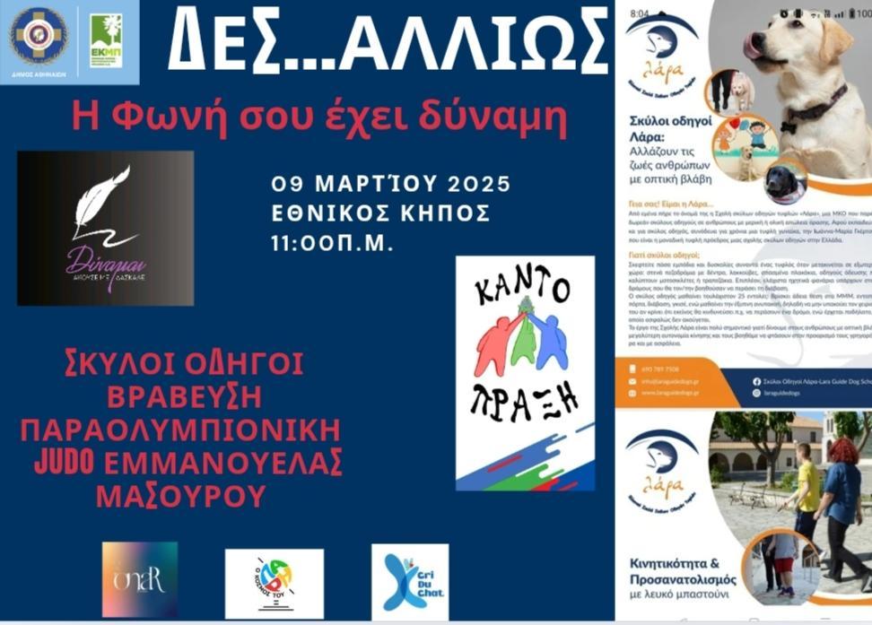 Κεντρικό θέμα της εκδήλωσης θα είναι οι σκύλοι οδηγοί, ενώ θα βραβευθεί και η Παραολυμπιονίκης του τζούντο Εμμανουέλα Μασούρου.