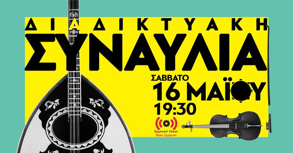 Η Εργατική Λέσχη Νέας Σμύρνης (ΕΛΝΣ) διοργανώνει το Σάββατο 16 Μαΐου στις 19.30μμ διαδικτυακή συναυλία λαϊκής και ρεμπέτικης μουσικής, με στόχο την οικονομική και πολιτικήυποστήριξη του κλάδου των μουσικών που πλήττονται σημαντικά από τα μέτρα της κυβέρνησης της Ν.Δ. Θα συμμετάσχουν αρκετοί καλλιτέχνες που στο παρελθόν στήριξαν με την συχνή παρουσία τους την Εργατική Λέσχη, τις πολιτιστικές και άλλες δράσεις μας.