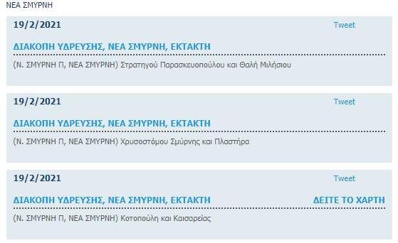 Η ΕΥΔΑΠ ενημερώνει ότι έχει διακοπεί η παροχή ύδρευσης σε συγκεκριμένες οδούς στη Ν. Σμύρνη έως τις 15:00 της ίδιας ημέρας