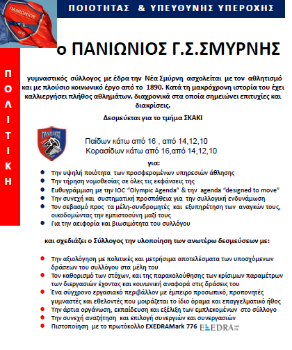 Ο Πανιώνιος ΓΣ ως ιστορικό σωματείο, στο τμήμα ΣΚΑΚΙ ορίζει την πολιτική ποιότητας και υπεύθυνης υπεροχής οπου η ιστορικη μνήμη και ο αθλητισμός δένουν με την τεχνοκρατική προσέγγιση της οργάνωσης .των προτύπων και των πιστοποιήσεων.