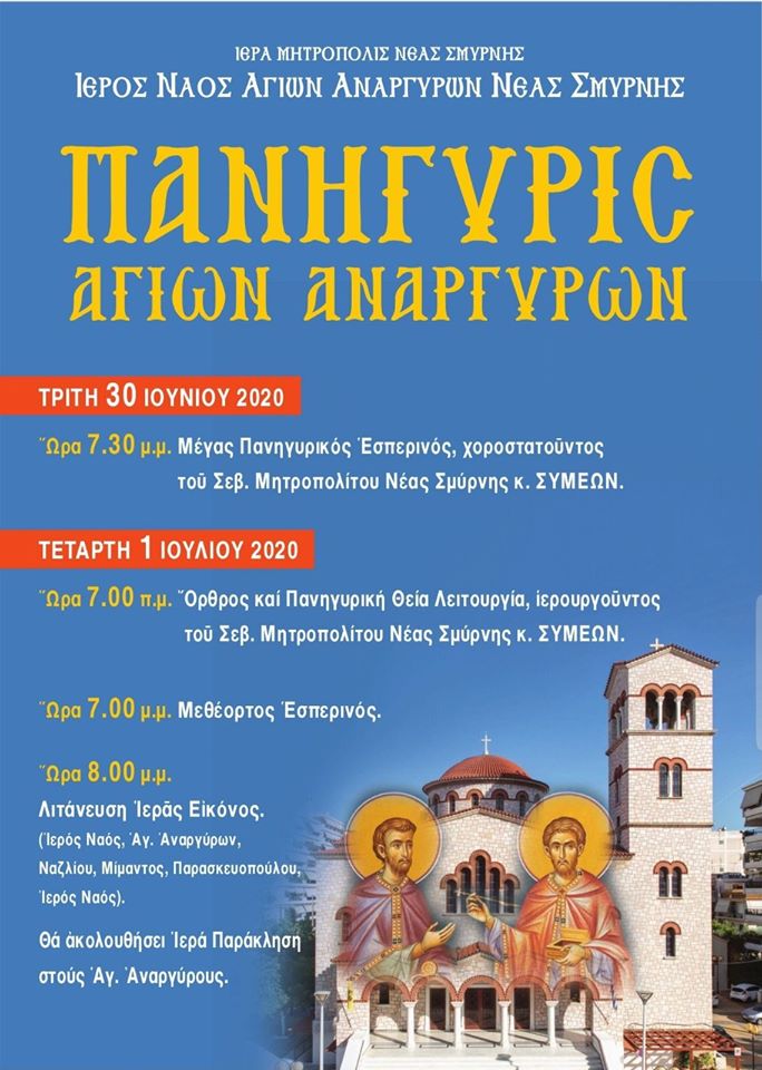 Την Τετάρτη 1 Ιουλίου πανηγυρίζει ο Ιερός Ναός των Αγίων Αναργύρων Ν.Σμύρνης. Την ίδια μέρα το απόγευμα στις 8μμ θα γίνει η ΛΙΤΑΝΕΥΣΗ της Ιεράς Εικόνας των Αγίων