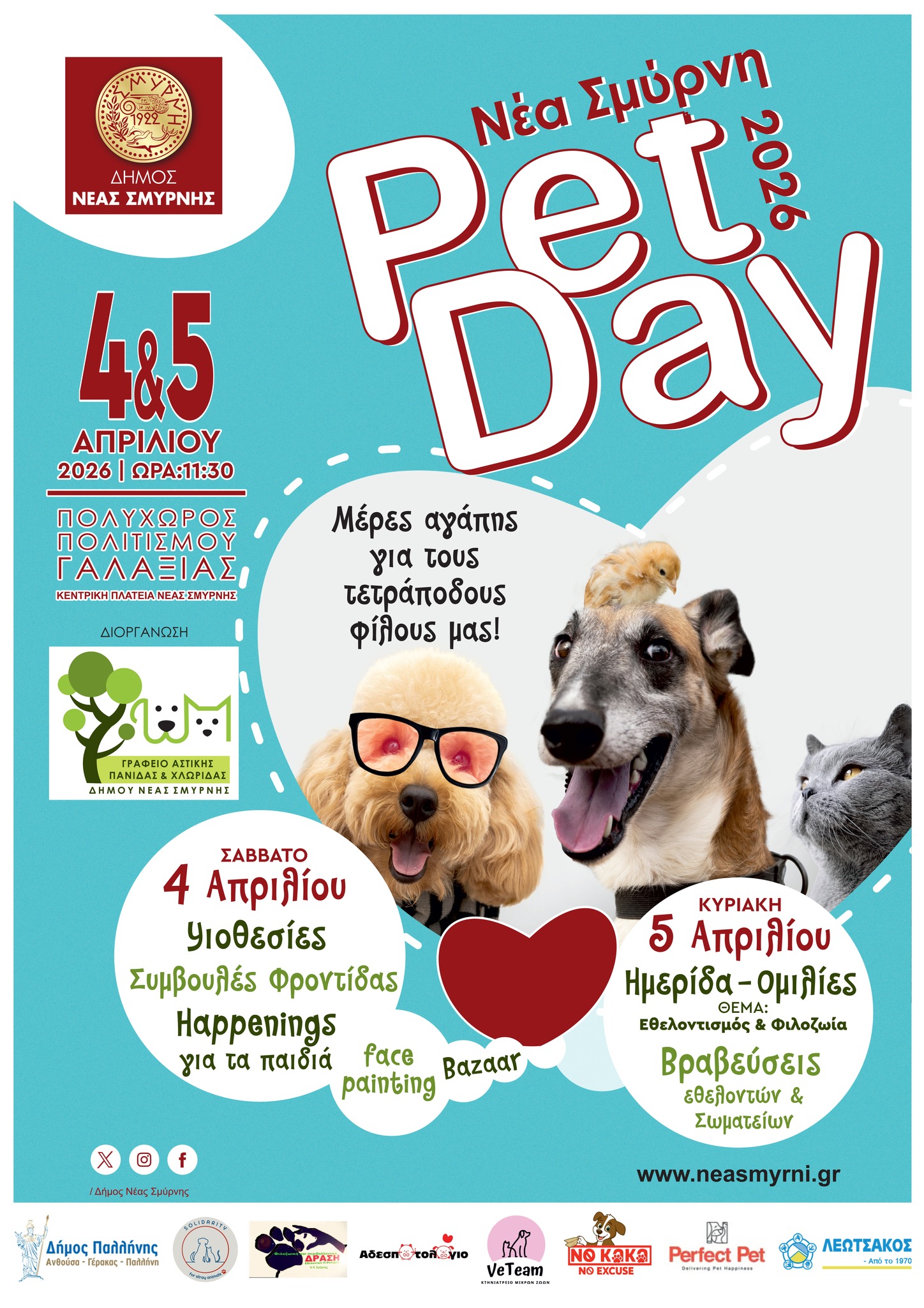 Ένα ξεχωριστό διήμερο αφιερωμένο στην φροντίδα των αδέσποτων και την αξία της προσφοράς διοργανώνει το Γραφείο Αστικής Πανίδας του Δήμου Νέας Σμύρνης το Σάββατο 4 και την Κυριακή 5 Απριλίου στον Δημοτικό Πολυχώρο «Γαλαξίας».
