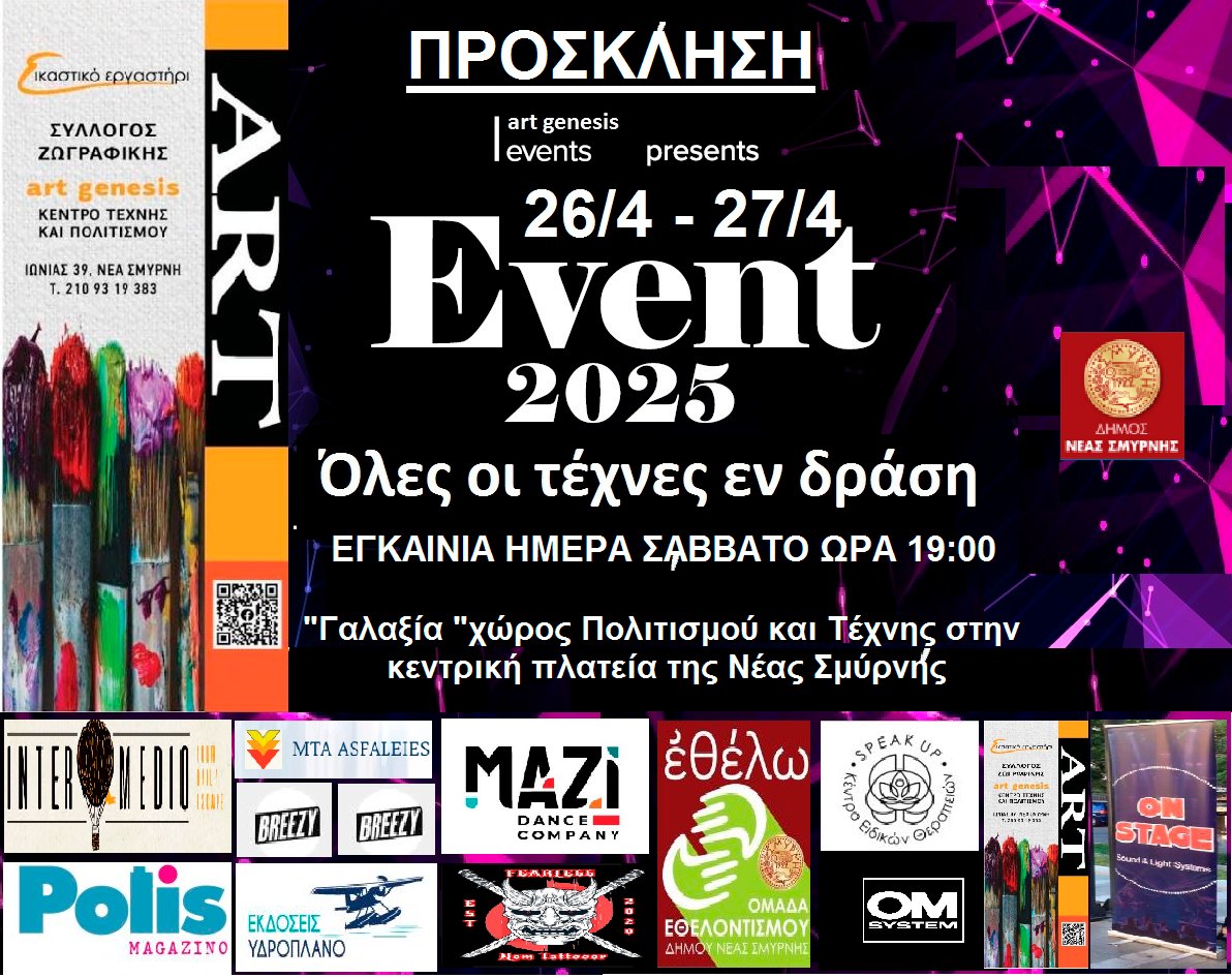 Ένα διήμερο φεστιβάλ Πολιτισμού και Τέχνης διοργανώνει η ART GENESIS ΚΕΝΤΡΟ ΤΕΧΝΗΣ ΚΑΙ ΠΟΛΙΤΙΣΜΟΥ στις 26 και 27 Απριλίου στον Δημοτικό Πολυχώρο "Γαλαξίας".
