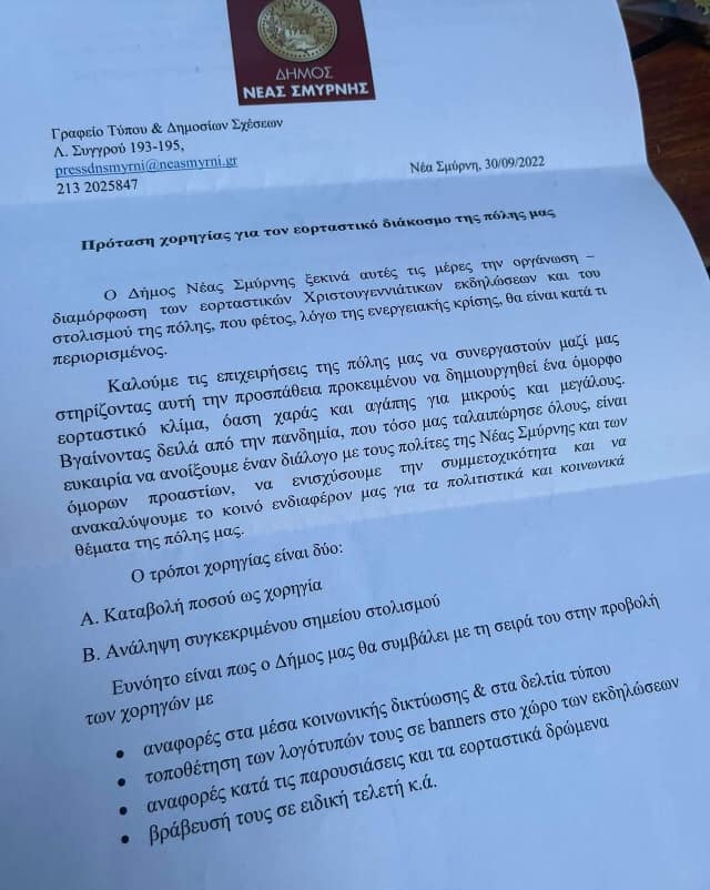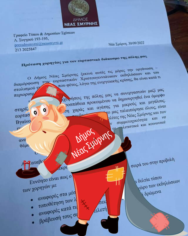 Σε "ζητιάνο" των τοπικών επιχειρήσεων θα ντυθεί εφέτος ο Δήμος Νέας Σμύρνης, αφού με επιστολή από το Γραφείο Τύπου Νέας Σμύρνης ζητά απο τους επιχειρηματίες της πόλης να ενισχύσουν τον Δήμο Νέας Σμύρνης με χρήματα ή να αναλάβουν οι ίδιες επιχειρήσεις να διακοσμήσουν τον δημόσιο χώρο.