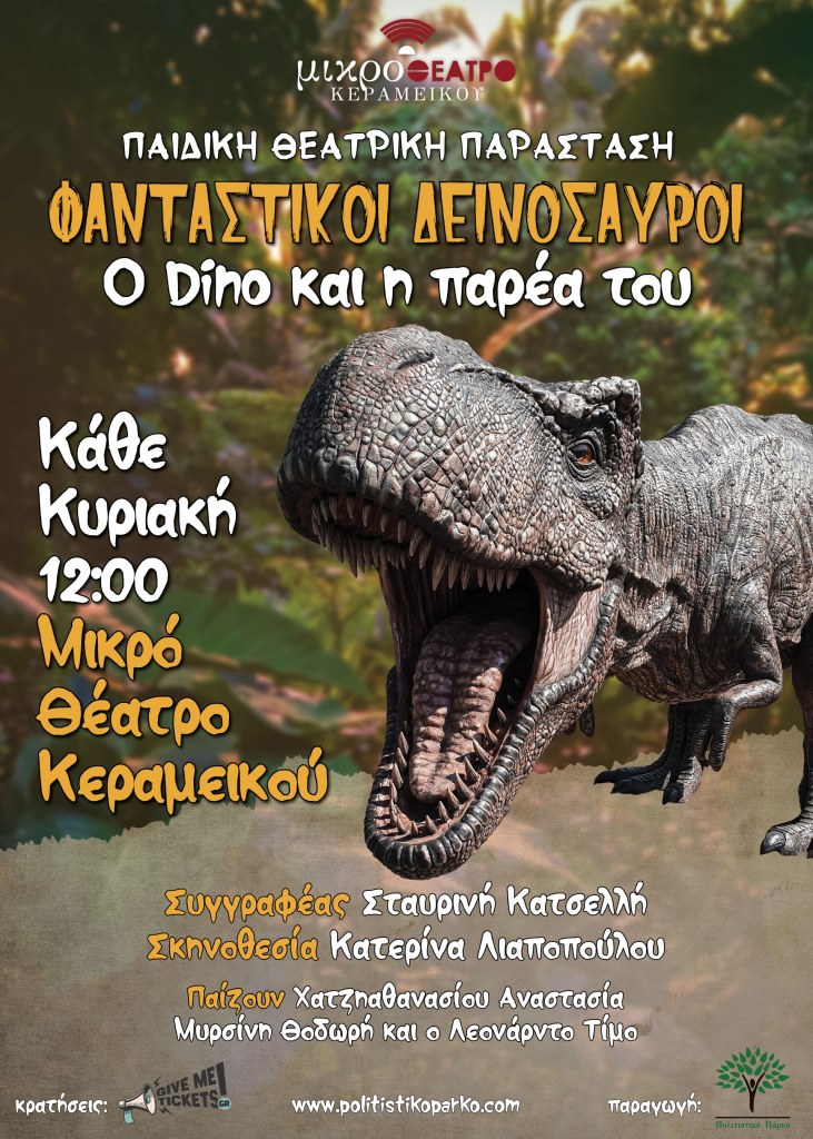 Το Πολιτιστικό Πάρκο παρουσιάζει την διαδραστική θεατρική παράσταση για παιδιά άνω των τεσσάρων ετών της Σταυρινής Κατσελλή «ΦΑΝΤΑΣΤΙΚΟΙ ΔΕΙΝΟΣΑΥΡΟΙ – Ο Dino και η παρέα του »