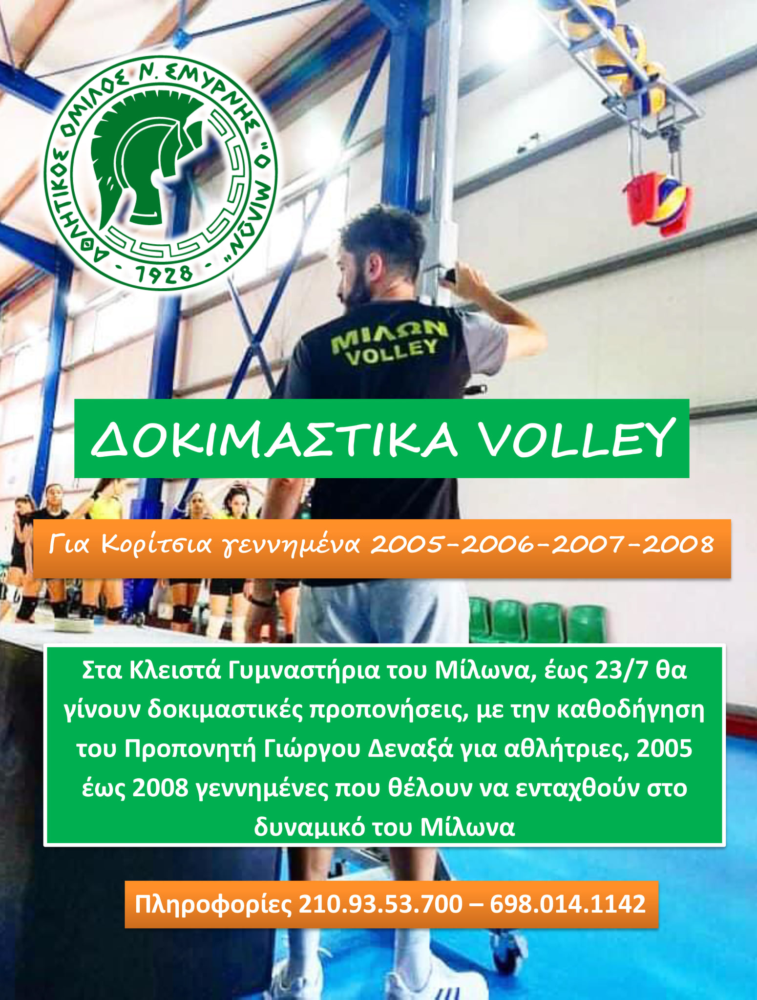 Δοκιμαστικές προπονήσεις για κορίτσια γεννημένα το 2005, 2006, 2007 και 2008 που θέλουν να ασχοληθούν με το βόλεϊ θα πραγματοποιηθούν στις εγκαταστάσεις του Μίλωνα μέχρι τις 23 Ιουλίου.