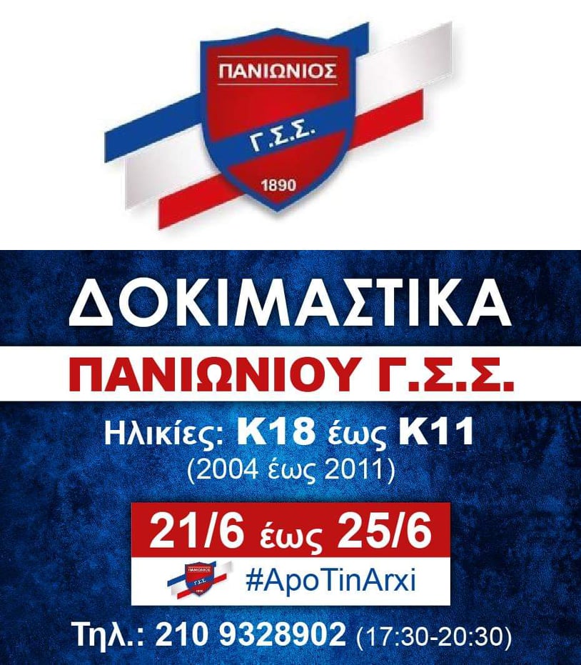 Ο ΠΑΝΙΩΝΙΟΣ Γ.Σ.Σ. ανακοινώνει ότι θα πραγματοποιηθούν δοκιμαστικές προπονήσεις ποδοσφαιριστών που έχουν γεννηθεί το έτος : 2004-2005-2006-2007-2008-2009-2010 και 2011 για την στελέχωση των τμημάτων Κ18 , Κ17 , Κ16 , Κ15 , Κ14 ,Κ13 ,K12 , Κ11 αντίστοιχα με το παρακάτω πρόγραμμα :