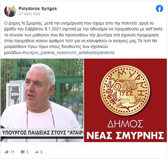 Τις ελλείψεις σε self tests ανέλαβε να καλύψει ο Δήμος Νέας Σμύρνης, προκειμένου να τα προμηθεύσει στα σχολεία της πόλης.