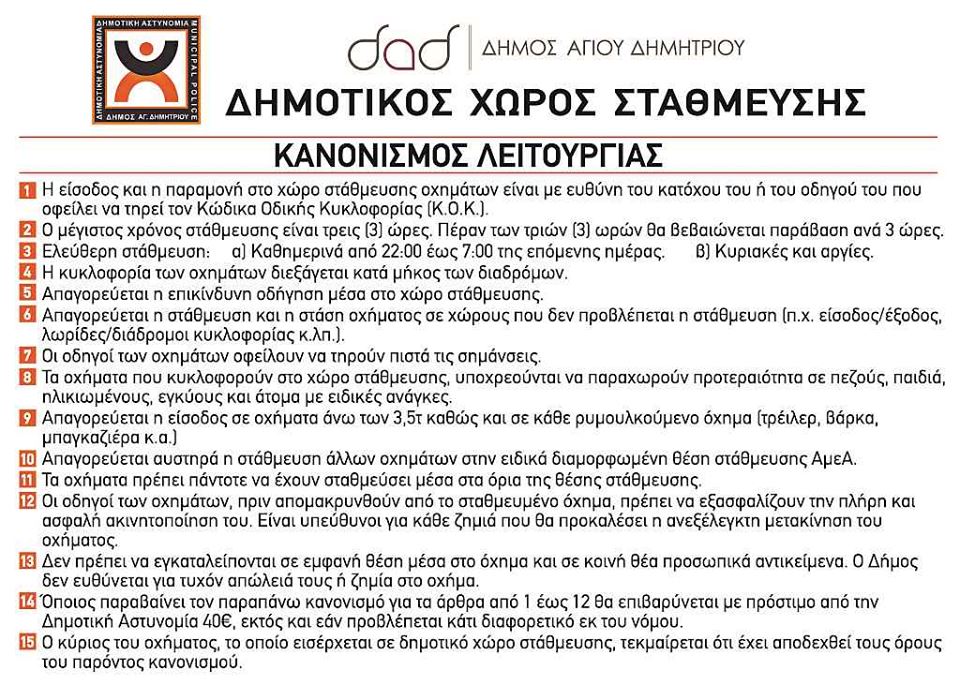 Τη δυνατότητα να σταθμεύσουν δωρεάν το αυτοκίνητό τους στο Δημοτικό Πάρκινγκ του Δήμου Αγίου Δημητρίου έχουν οι πολίτες. Το πάρκινγκ βρίσκεται στην οδό Καλλιφρονά 17 και επιτρέπει σε κατοίκους και επισκέπτες της πόλης 3ωρη ελεύθερη στάθμευση κατά τη διάρκεια λειτουργίας της τοπικής αγοράς (08:00 – 22:00), ενώ τις Κυριακές και τις αργίες είναι ανοιχτό ολόκληρο το 24ώρο.