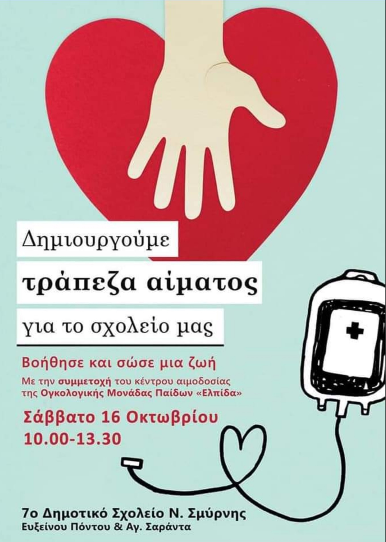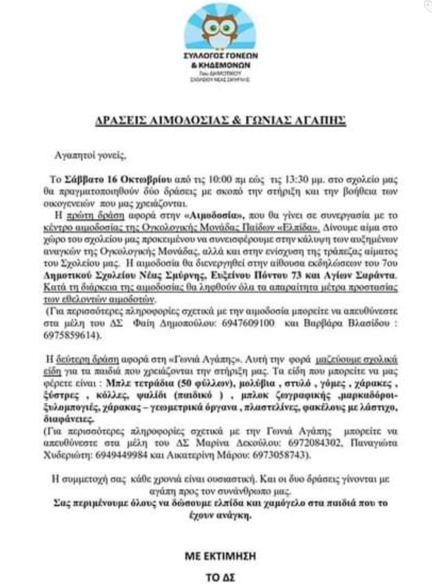Το 7ο Δημοτικο σχολείο Νέας Σμύρνης όπου βρίσκεται στην Εύξεινου Πόντου και Αγίων Σαράντα κάνει το Σάββατο 16 Οκτωβρίου δράσεις αλληλεγγύης