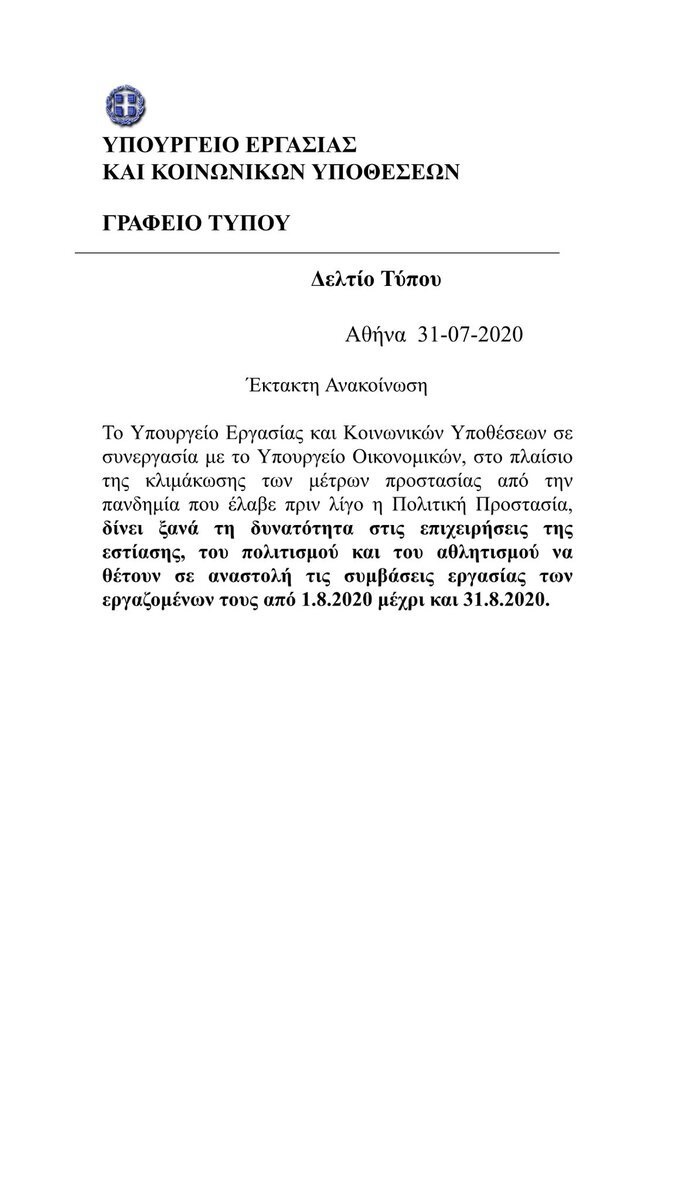 ''Το Υπουργείο Εργασίας και Κοινωνικών Υποθέσεων σε συνεργασία με το Υπουργείο Οικονομικών, στο πλαίσιο της κλιμάκωσης των μέτρων προστασίας από την πανδημία που έλαβε η Πολιτική Προστασία, δίνει ξανά τη δυνατότητα στις επιχειρήσεις της εστίασης, του πολιτισμού και του αθλητισμού να θέτουν σε αναστολή τις συμβάσεις εργασίας των εργαζομένων τους από 1.8.2020 μέχρι και 31.8.2020.